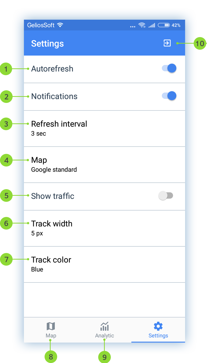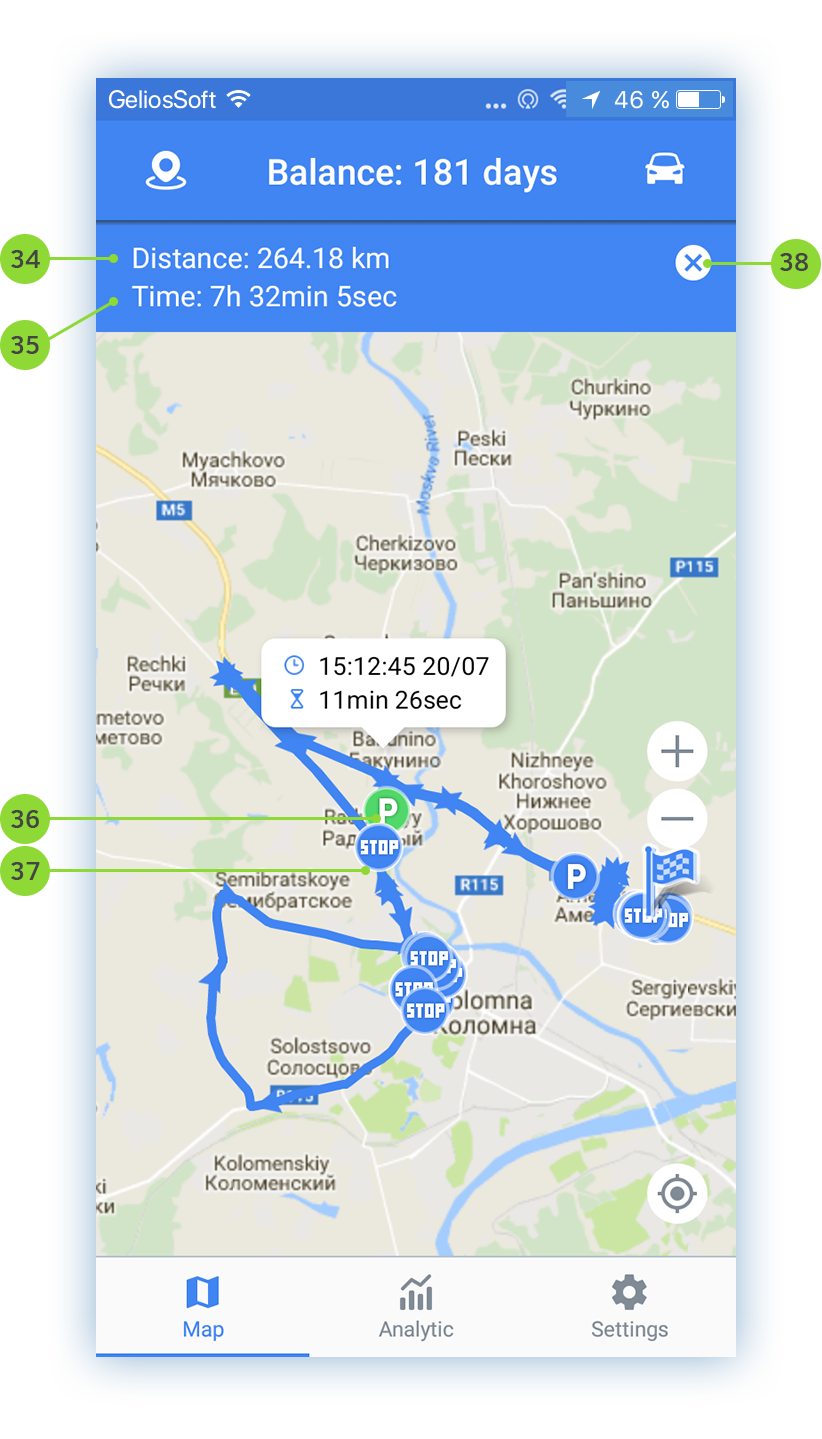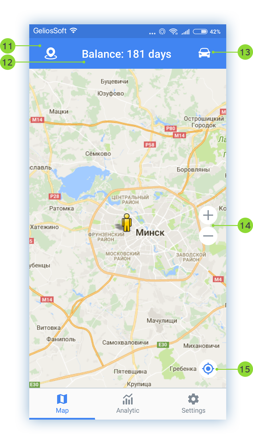 The app is conditionally divided into 3 screens: Map, Analytics, Settings. Please, first of all, read the settings of the app for more convenient using.