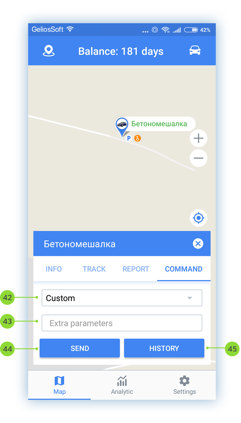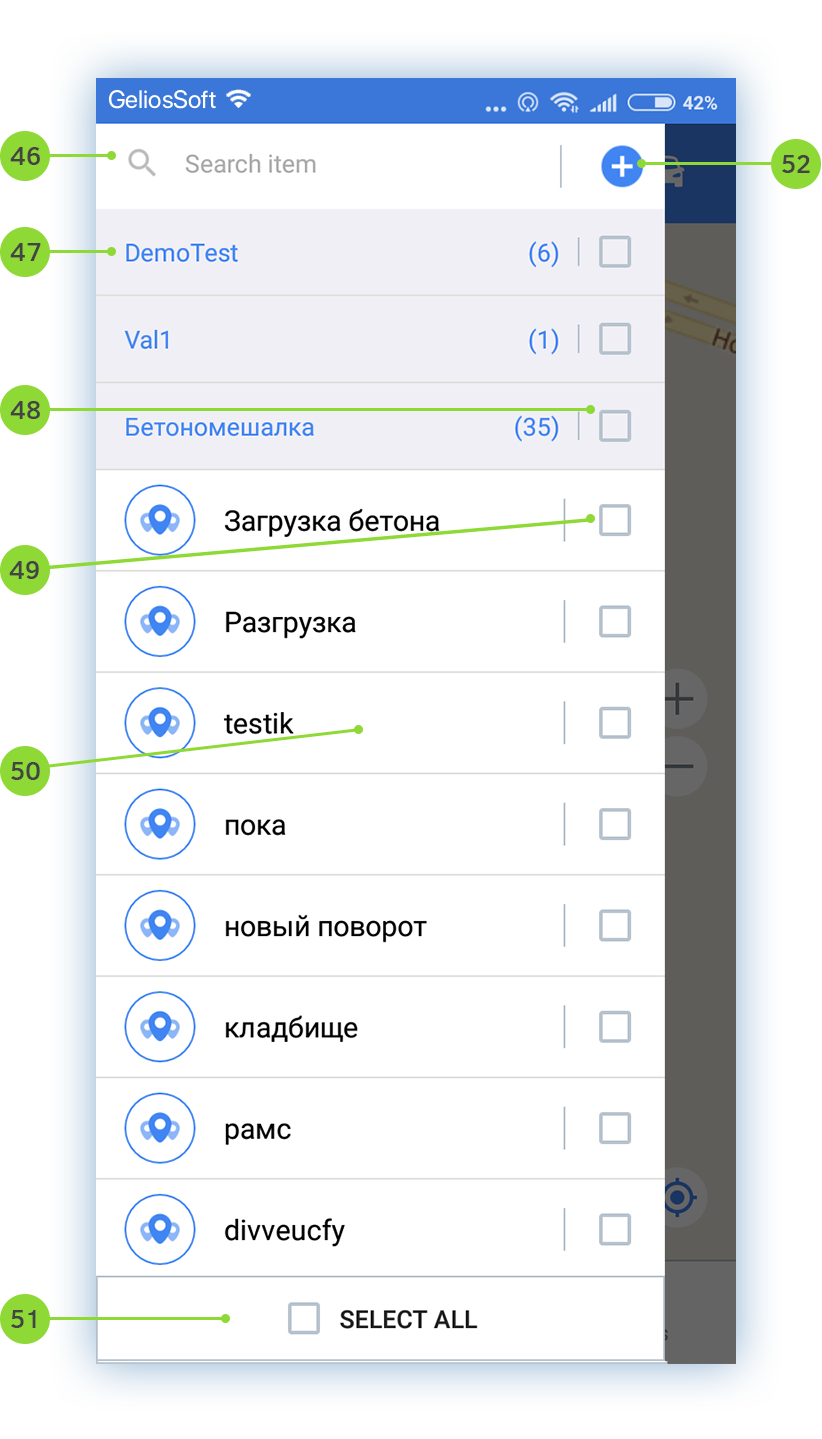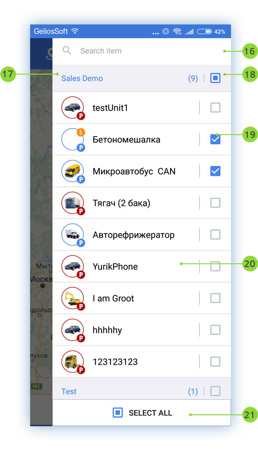 The Map screen is multifunctional. Here you can work with units, as well as with geofences.