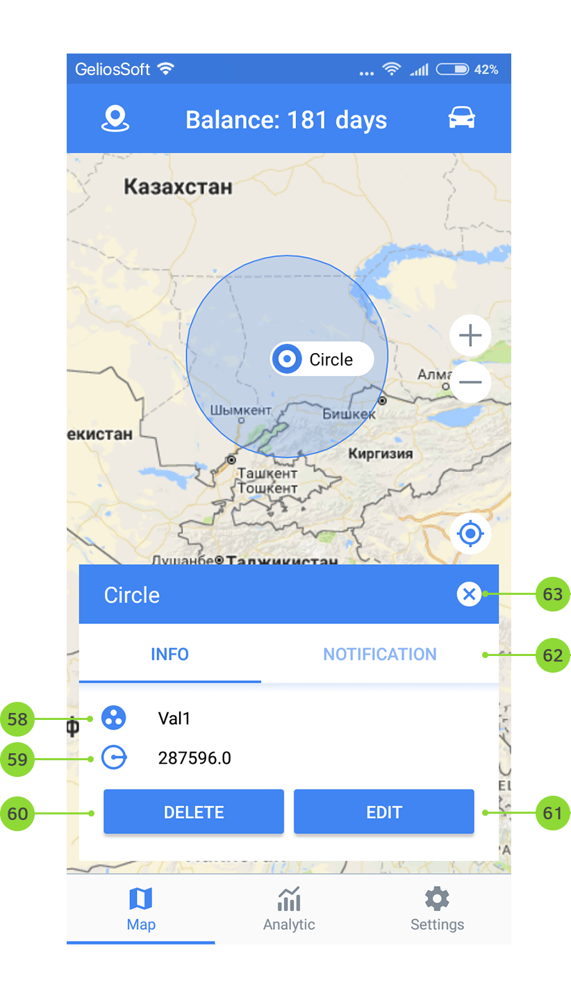 Tap on the geofence icon on the map to start working with it. The menu of the geofence with possibilities will be displayed on the screen: