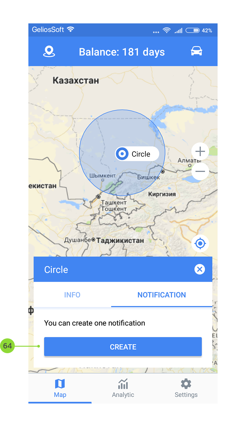 - Available creation of one notification on geofence control. Click "Create" to start creation a notification on geofence control