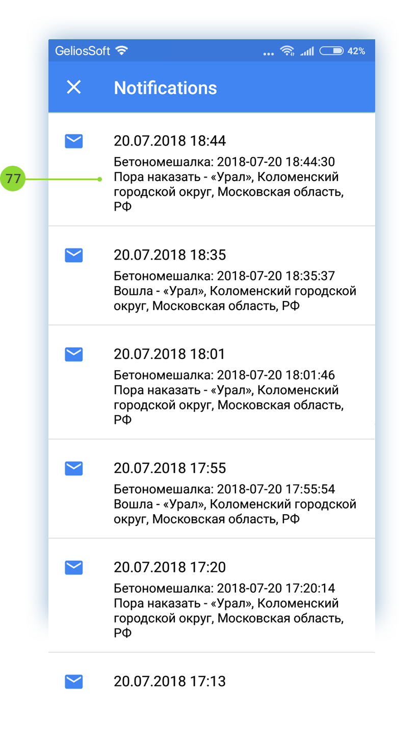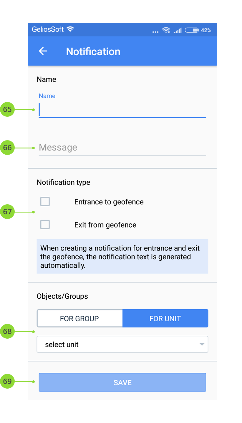 - Enter notification text (Attention! When creating notification for entrance and exit the geofence, the notification text is generated automatically);