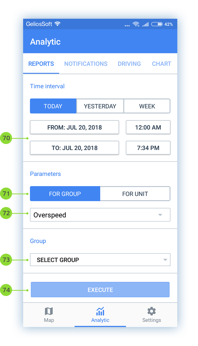 - Select the time period for which you want to analyze driver quality. Use fast interval selection with the buttons: «Today», «Yesterday», «Week», or select your own interval;