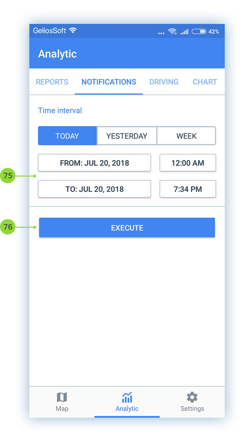 - Select the time period for which you want to get list of notifications. Use fast interval selection with the buttons: «Today», «Yesterday», «Week», or select your own interval;