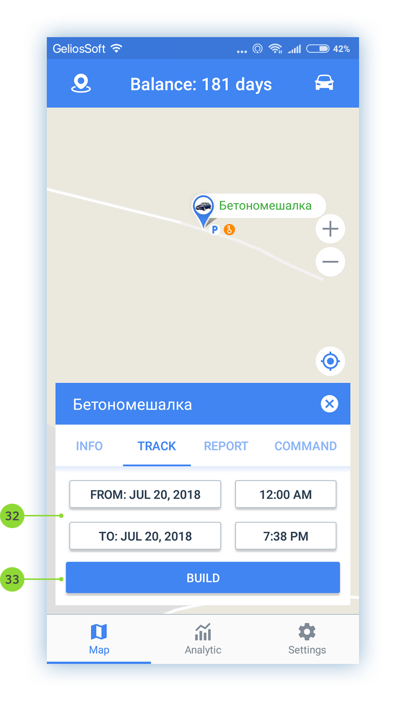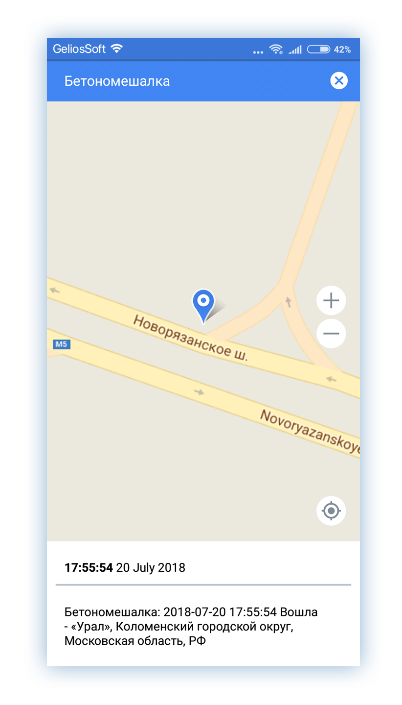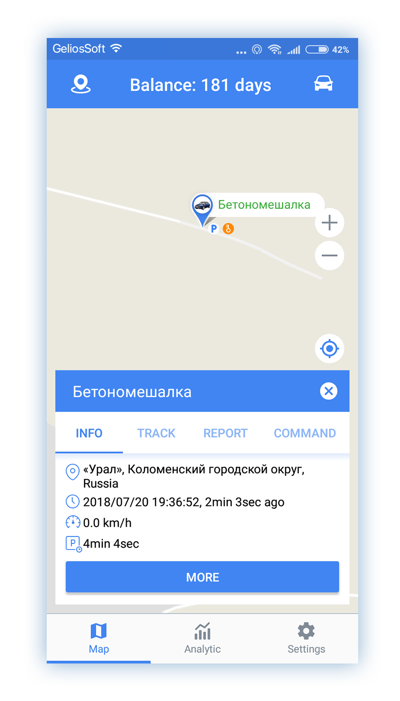 - Tap on the unit name in the list to go to the unit on the map. You can track the movement of the unit taking into account the specified interval of autorefresh in the settings of the app;